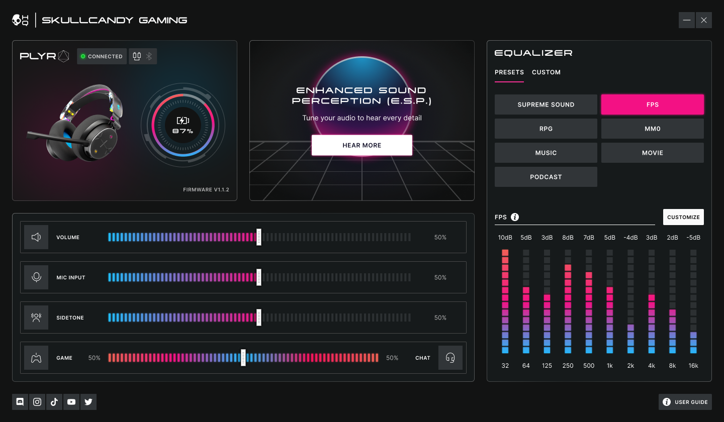 Skullcandy gaming software provides everything you need to dial in your SLYR Pro Wireless, SLYR Pro, and PLYR headsets. Whether you want to set the equalizer to First Person Shooter (FPS) or music mode within the equalizer panel, adjust game/chat mix and sidetone levels, or take the Enhanced Sound Perception (ESP) test and tune your headset to your unique hearing, our suite of tools will take your in-game audio to the next level.