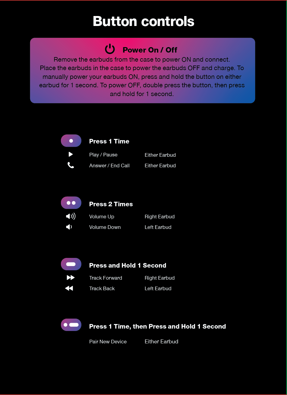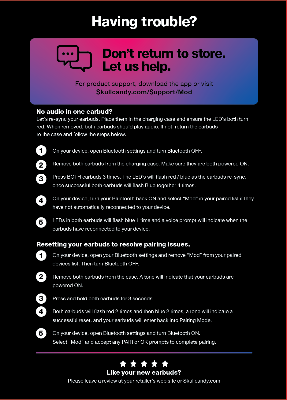 Out of the box, Mod’s default media controls are ready to keep you connected and in control of your Bluetooth enabled device. First, we’ll list the default controls when your device is first paired, but please note that you can also link with the Skullcandy App to further customize and add features to your earbud button controls.